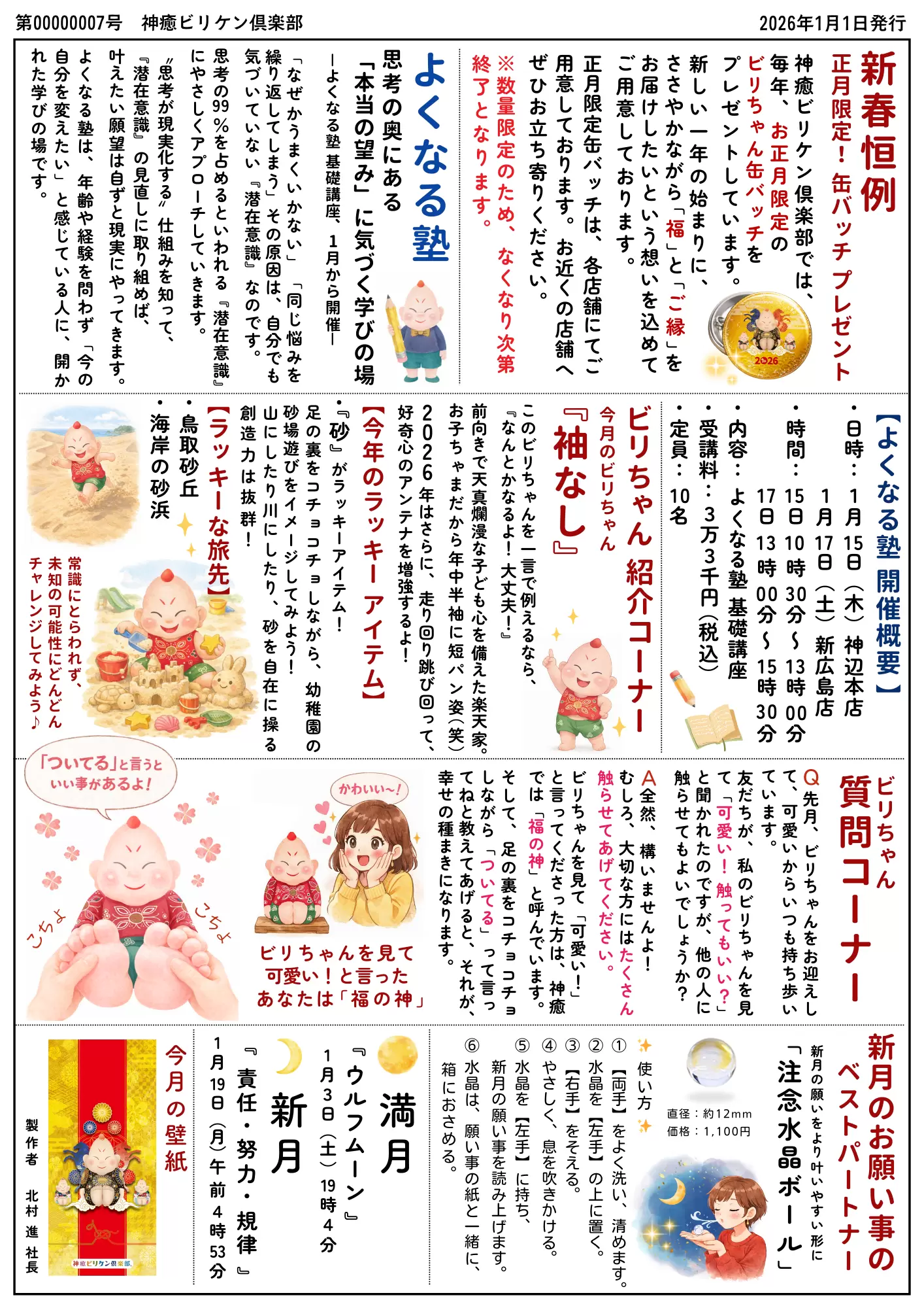 1/19(月)は、新月です。 時間は、午前4時53分(〜12時53分までの間)です。 早朝から新月に入りますので、 朝起きたらすぐ書けるように準備して寝ましょう。 今回の新月は、 『責任・努力・規律』がテーマです。 自分が本当に果たしたい責任は何かを問い直し、 その一つひとつを見つめ直すタイミングです。 すぐに結果が出なくても、 諦めずに積み重ねる努力が、 未来の飛躍の土台となります。 さらに、時間やルール、 日々の習慣を見直し、 規律を意識することで、 人生の土台はより堅実に育っていきます。 書き方の例としては、 -------------------------------------- ・私は、自分の使命に向き合い、必要な責任を軽やかに果たせています。 ・私は、毎日 小さな努力を続け、大きな成果につながっています。 ・私は、時間や習慣を整え、規律ある心地よい生活ができています。 ・私は、やることを整理したことで、時間と心のゆとりができました。 -------------------------------------- などを参考にしてください。 お願い事をどんどん叶えて、ワクワクした人生を送りましょう。 1/19(月)は、新月です。 時間は、午前4時53分(〜12時53分までの間)です。 早朝から新月に入りますので、 朝起きたらすぐ書けるように準備して寝ましょう。 今回の新月は、 『責任・努力・規律』がテーマです。 自分が本当に果たしたい責任は 何かを問い直し、 その一つひとつを見つめ直す タイミングです。 すぐに結果が出なくても、 諦めずに積み重ねる努力が、 未来の飛躍の土台となります。 さらに、時間やルール、 日々の習慣を見直し、 規律を意識することで、 人生の土台はより堅実に育っていきます。 書き方の例としては、 -------------------------------------- ・私は、自分の使命に向き合い、 必要な責任を軽やかに果たせています。 ・私は、毎日 小さな努力を続け、 大きな成果につながっています。 ・私は、時間や習慣を整え、 規律ある心地よい生活ができています。 ・私は、やることを整理したことで、 時間と心のゆとりができました。 -------------------------------------- などを参考にしてください。 お願い事をどんどん叶えて、ワクワクした人生を送りましょう。 お願い事のやり方 お願い事を書く紙を用意する 紙はなんでも構いませんが、出来ればお店で渡している「専用のお願いごとの紙」を使用することをお勧めします。 書くときの注意点 ①お願い事はペンを使用して、10個以内で、ていねいに書いて下さい(消すことが出来る鉛筆などは使用しないで下さい) ②自分のお願い事を「~できました」「~なりました」のような完了形で書きます。また「○○さんの病気が治りますように…」などのように、他人主体なお願い事ではなく自分主体で書くようにしましょう。 ③自分のお願い事が叶った状態を想像しながら、なるべくワクワクした気持ちで書きましょう。 ④お願い事を書き終えたら「ビリちゃん、お月さまに私のお願い事を届けてくれてありがとう」と書き、氏名と日付を書いて下さい。 紙の保管場所 ★紙のままではなく、必ず箱の中で保管して下さい。 箱は、特に指定はありませんが、自分の大切なお願い事を入れる箱ですので、なるべく上質なものを選びましょう。 盛り塩セット(家庭用)の空箱 や 24金箔カードの桐箱もおススメです。 *24金箔カードの桐箱には、注念水晶ボールが入らないので、注意してください。 お願い事が叶うのを待つ ★ここまで準備が出来たら、新月&ビリちゃんのパワーにお任せして、ワクワクしながら待つだけです。 ★新月から2週間後の満月までの間に、何らかの変化がありますので、チャンスを逃さないでくださいね! ※願い事を書いた紙は、1年間を目安に保管し、1年を過ぎたら捨てて下さい。 ※新月は約1か月に1回の割合でやってきます。毎回書いても、好きな新月を選んで書いても良いですよ。