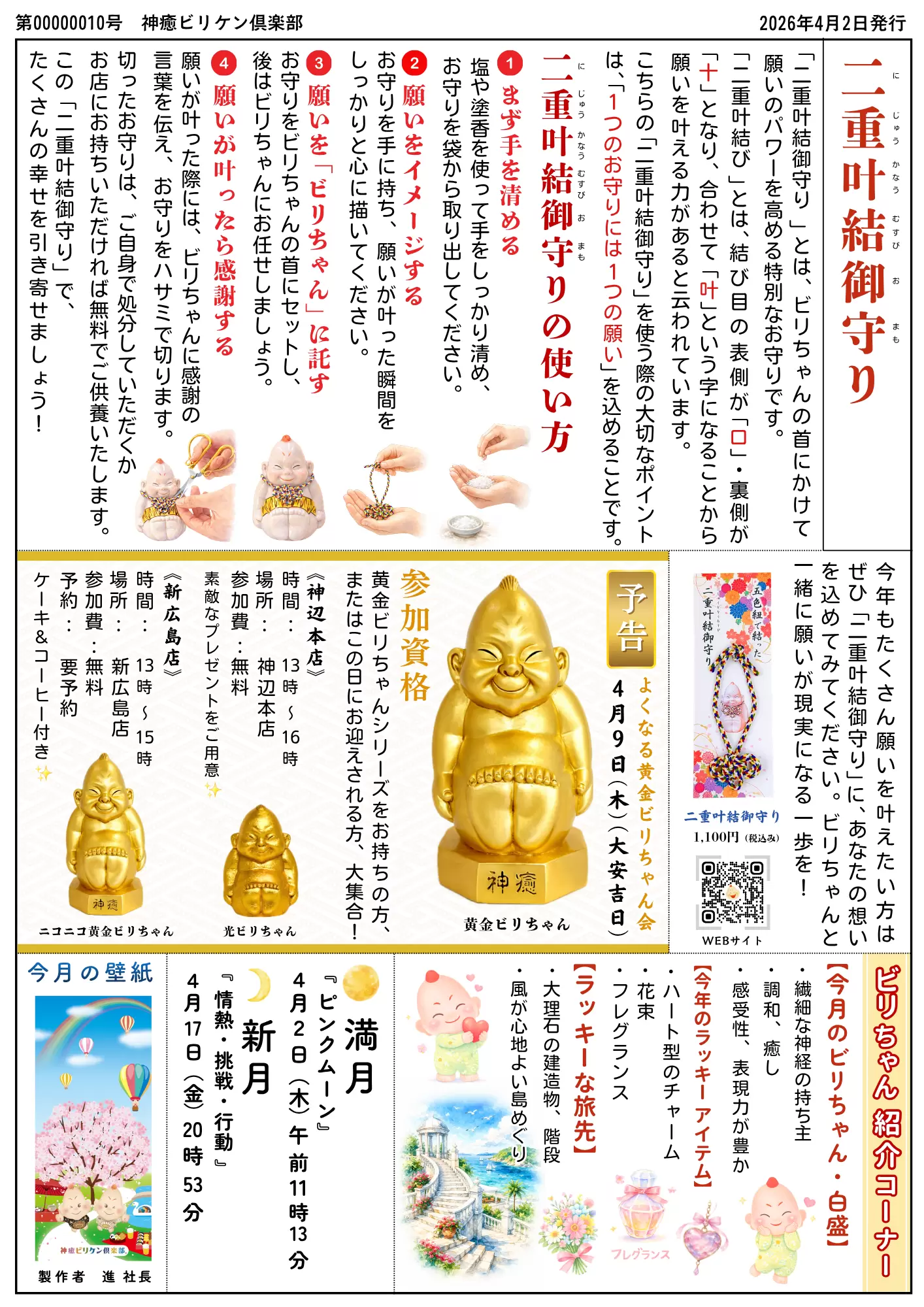 4/17(金)は、新月です。 時間は、20時53分(〜翌午前4時53分までの間)です。 夜から新月に入りますので、 寝る前にしっかりイメージして書きましょう。 今回の新月は、 『情熱・挑戦・行動』がテーマです。 心に秘めた情熱に火を灯し、 思い切って挑戦への第一歩を 踏み出しましょう。 自分軸で行動を起こすことで、 内なる力が目覚め、 勢いよく前進します。 その炎を絶やさず燃やし続けることで、 輝く未来が自然と開かれていきます。 書き方の例としては、 -------------------------------------- ・私は、自分の情熱に気づき、 やりたいことを行動に移すことができました。 ・私は、新しいことに勇気を出して挑戦し、 素晴らしいご縁に恵まれました。 ・私は、自分軸で行動できるようになり、 チャンスがどんどん広がりました。 ・私は、一歩踏み出したことで、 輝く未来への道が開かれました。 -------------------------------------- などを参考にしてください。 お願い事をどんどん叶えて、ワクワクした人生を送りましょう。 4/17(金)は、新月です。 時間は、20時53分(〜翌午前4時53分までの間)です。 夜から新月に入りますので、 寝る前にしっかりイメージして書きましょう。 今回の新月は、 『情熱・挑戦・行動』がテーマです。 心に秘めた情熱に火を灯し、 思い切って挑戦への第一歩を 踏み出しましょう。 自分軸で行動を起こすことで、 内なる力が目覚め、 勢いよく前進します。 その炎を絶やさず燃やし続けることで、 輝く未来が自然と開かれていきます。 書き方の例としては、 -------------------------------------- ・私は、自分の情熱に気づき、 やりたいことを行動に移すことができま した。 ・私は、新しいことに勇気を出して挑戦し、 素晴らしいご縁に恵まれました。 ・私は、自分軸で行動できるようになり、 チャンスがどんどん広がりました。 ・私は、一歩踏み出したことで、 輝く未来への道が開かれました。 -------------------------------------- などを参考にしてください。 お願い事をどんどん叶えて、ワクワクした人生を送りましょう。 お願い事のやり方 お願い事を書く紙を用意する 紙はなんでも構いませんが、出来ればお店で渡している「専用のお願いごとの紙」を使用することをお勧めします。 書くときの注意点 ①お願い事はペンを使用して、10個以内で、ていねいに書いて下さい(消すことが出来る鉛筆などは使用しないで下さい) ②自分のお願い事を「~できました」「~なりました」のような完了形で書きます。また「○○さんの病気が治りますように…」などのように、他人主体なお願い事ではなく自分主体で書くようにしましょう。 ③自分のお願い事が叶った状態を想像しながら、なるべくワクワクした気持ちで書きましょう。 ④お願い事を書き終えたら「ビリちゃん、お月さまに私のお願い事を届けてくれてありがとう」と書き、氏名と日付を書いて下さい。 紙の保管場所 ★紙のままではなく、必ず箱の中で保管して下さい。 箱は、特に指定はありませんが、自分の大切なお願い事を入れる箱ですので、なるべく上質なものを選びましょう。 盛り塩セット(家庭用)の空箱 や 24金箔カードの桐箱もおススメです。 *24金箔カードの桐箱には、注念水晶ボールが入らないので、注意してください。 お願い事が叶うのを待つ ★ここまで準備が出来たら、新月&ビリちゃんのパワーにお任せして、ワクワクしながら待つだけです。 ★新月から2週間後の満月までの間に、何らかの変化がありますので、チャンスを逃さないでくださいね! ※願い事を書いた紙は、1年間を目安に保管し、1年を過ぎたら捨てて下さい。 ※新月は約1か月に1回の割合でやってきます。毎回書いても、好きな新月を選んで書いても良いですよ。