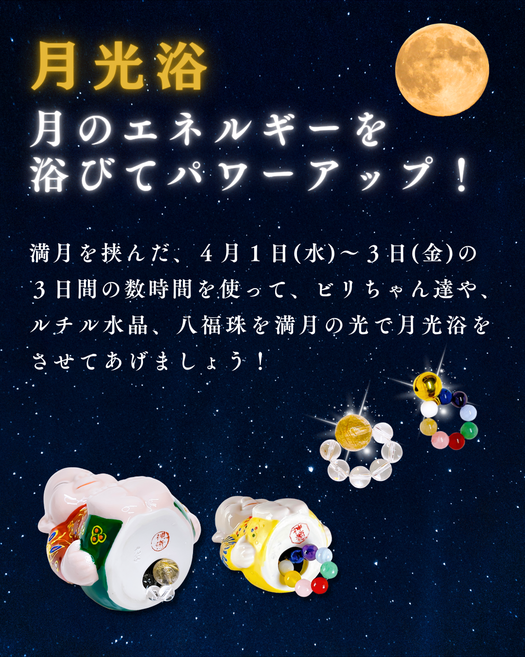 満月を挟んだ4月1日から3日間の数時間を使ってビリちゃん達や、ルチル水晶、八福珠を満月の光で月光浴させてあげましょう。