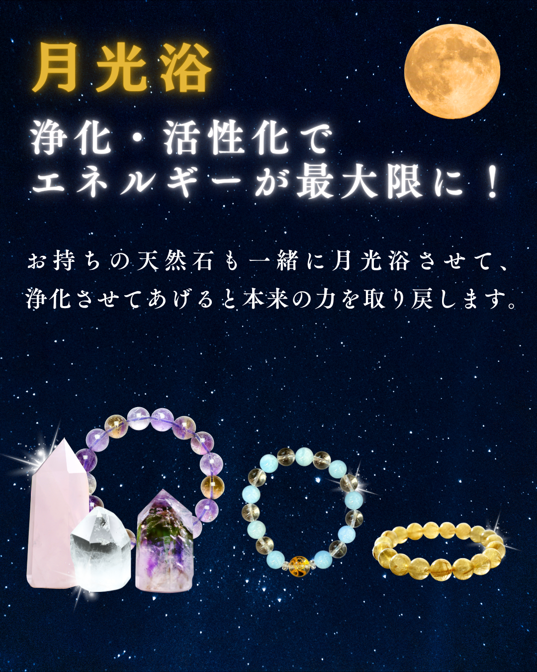 また、天然石(クラスター、さざれ、ブレスレットなど)をお持ちの方は、一緒に月光浴をさせて浄化すると、本来の力を取り戻します。