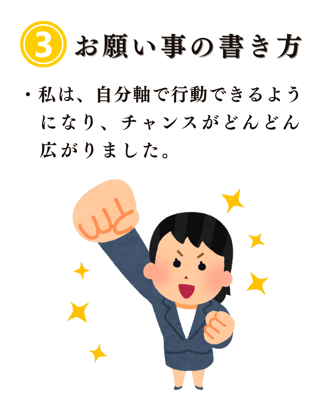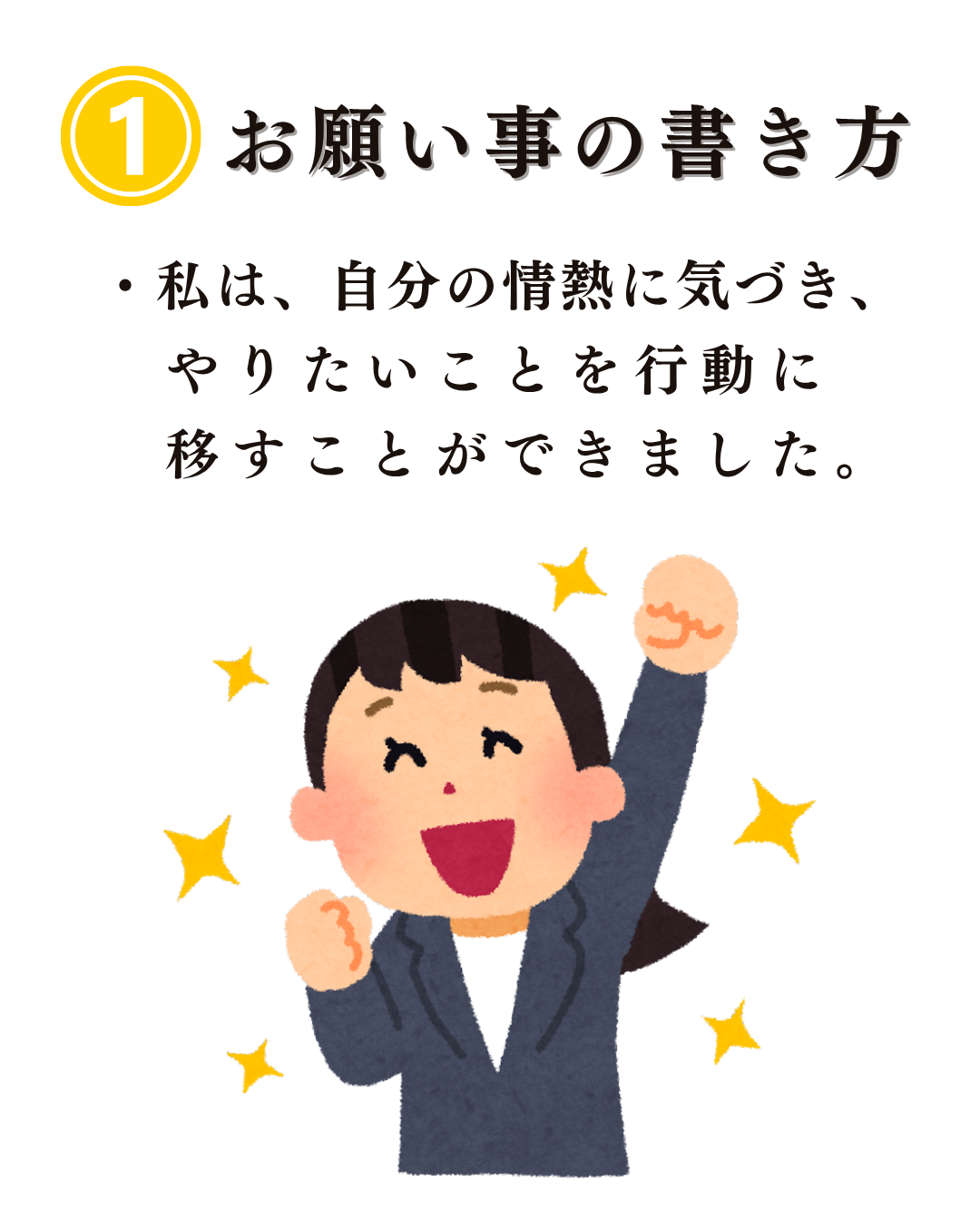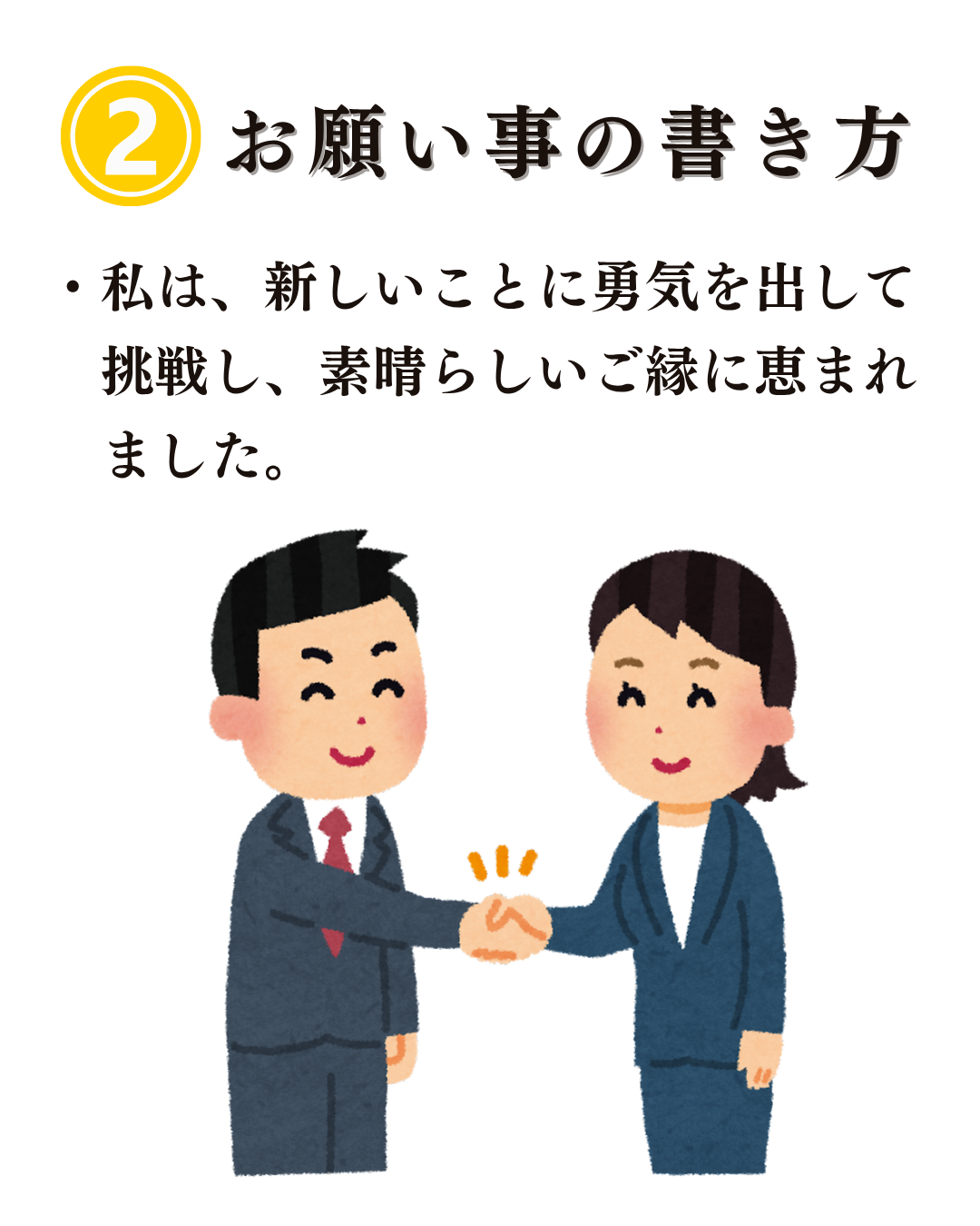 ②自分のお願い事を「~できました」「~なりました」のような完了形で書きます。また「○○さんの病気が治りますように…」などのように、他人主体なお願い事ではなく自分主体で書くようにしましょう。